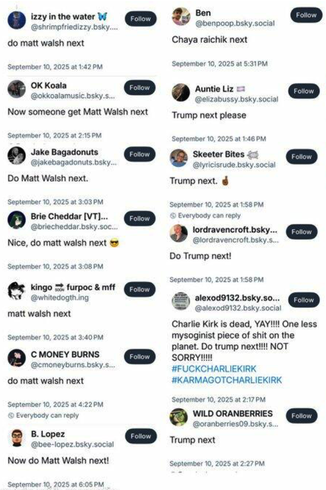 In the aftermath of Charlie Kirk’s death, many BlueSky users were suggesting prominent conservatives that should be assassinated next. The following are some of the examples that Zero Hedge posted earlier today…