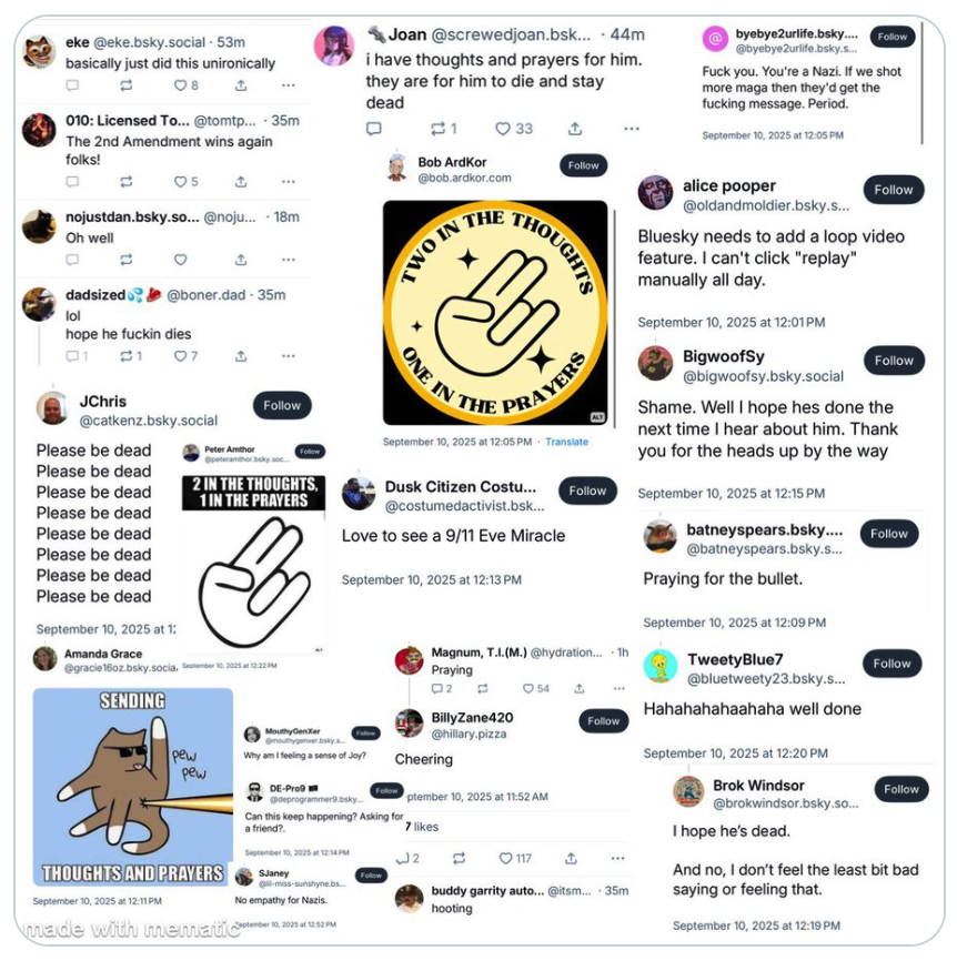 And here are some examples of the hatred that was being directed at Charlie Kirk by BlueSky users immediately after news broke that he had been shot…